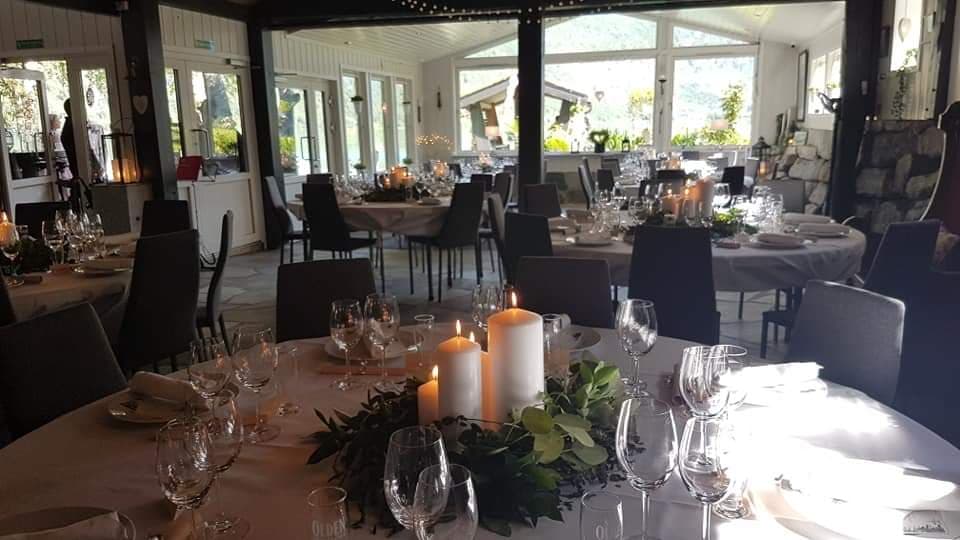 Sima salen er hovudbygget, der kan enn dekke til 110 personer. Ut på kvelden kan vi ta vekk nokre bord, så får enn dansegolv.